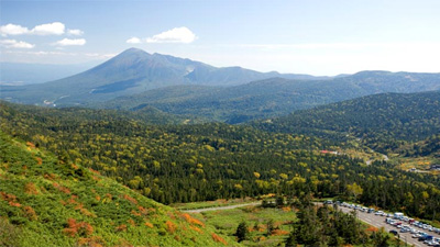 The volcanic plateau of Hachimantai ( 1,613 m ) is one of Japan's 100 Most Beautiful Mountains and Lake Towada in Aomori are together designated as Towada-Hachimantai National Park. There are scenic sightseeing roads that run through the area, as well as many swamps, marshes, and excellent hot springs. Hachimantai is beautiful any time of the year; in particular, usually from the end of September to mid October, the green summer leaves turn color, painting the mountain in various shades of red and yellow. The sightseeing road that stretches between Matsukawa Hot Spring and Toshichi Hot Spring is called the Hachimantai Jukai Line; at the peak, there is a rest house with a restaurant and a souvenir shop.