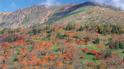 Mt. Sukawadake ( 1,628 m ) , which straddles three prefectures, is also known as Mt. Kurikomayama in other regions. On the mid-slope, there is Sukawa Kogen Hot Spring, which can only be approached from the Akita side at present. In summer, you will be greeted by various alpine plants, and in fall, you can enjoy the beautiful foliage. Climbing is easy and leisurely, taking only about 2 hours. Along the way, you will see a crater lake with emerald green water; the peak is about 1 hour away from the lake.