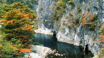 Gembikei Gorge is a dynamic 2-km gorge formed by the Iwai River flowing from Mt. Kurikoma. In 1927, it was designated as a national place of scenic beauty and a natural monument. The rough boulders on either side of the river and the beautiful clear water become colored with cherry blossoms in the spring, azaleas in the early summer, and the autumn foliage. The sound of the water echoes against the rocks and fills the gorge. From April through October, you can also ride an excursion carriage around the gorge.